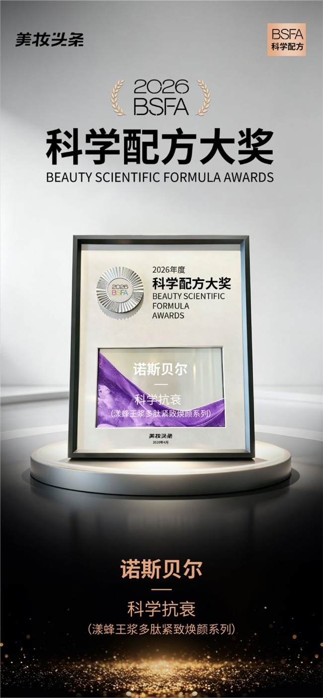 科学抗衰无疑是本次大会,乃至整个美妆界的重点关注方向。针对这一未来十年将会驱动行业持续增长的核心引擎,诺斯贝尔重磅推出漾蜂王浆多肽紧致焕颜系列。该系列主打NBC专研胜肽-RoyalPep™蜂王御龄肽,依托细胞级抗衰技术,精准作用于肌底,重塑肌肤弹性,强韧肌肤屏障。漾蜂王浆多肽紧致焕颜系列此次荣获2026年度科学配方科学抗衰大奖,既是行业对其卓越品质的高度认可,也是诺斯贝尔坚持用心做产品、踏实做研发的生动见证。